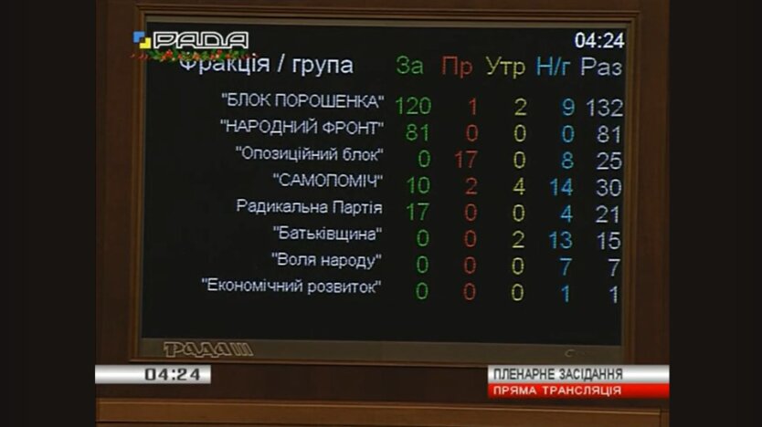 Ultimately, twelve lawmakers from the Petro Poroshenko Bloc abstained from voting, but the People's Front voted in its entirety, as did nearly all of the Radical Party. The missing votes were provided by several members of Samopomich.