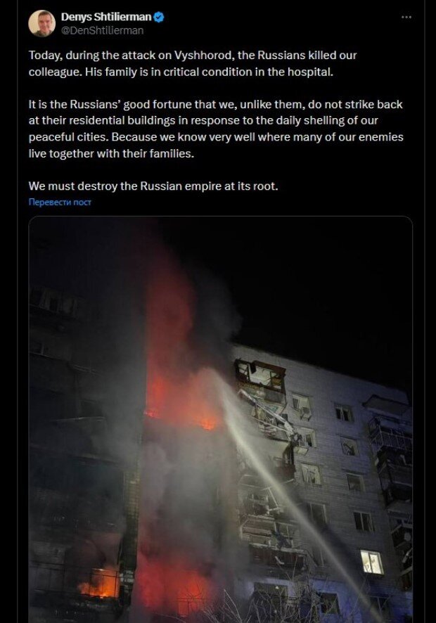 In his message, he reacted emotionally to the strike on Vyshhorod: "The Russians are lucky that, unlike them, we do not strike back at their residential buildings for the daily shelling of our peaceful cities, because we know very well where many of our enemies live along with their families. We must destroy the Russian empire root and branch."
