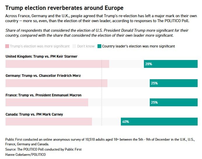 Canada was the only country where opinions were split nearly even. Mark Carney's April victory—with his promise to counter Trump—was seen by 40 percent as more significant than Trump's return to power. Nevertheless, a plurality of 45% still prioritized the importance of the U.S. election.