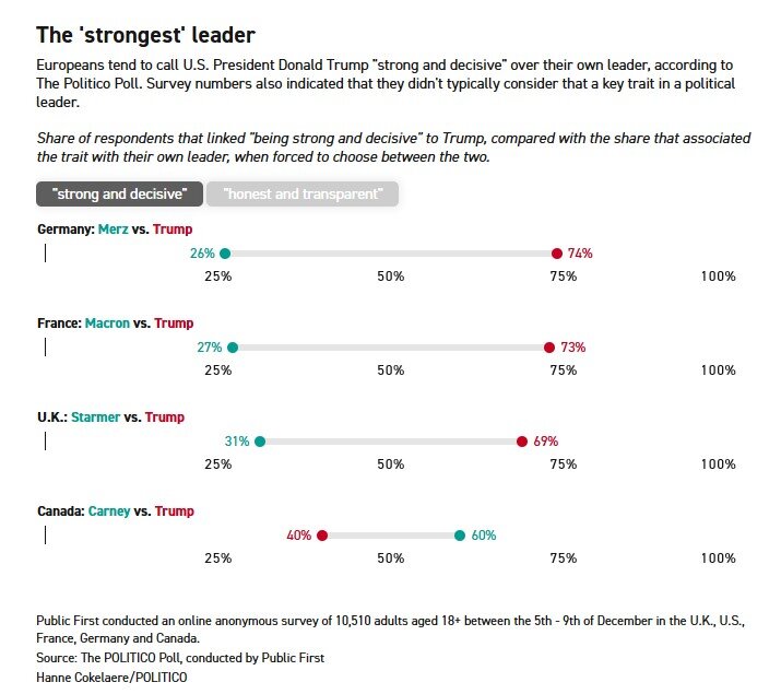 "Strength is not the most important trait for a leader, but it is clearly an area where the approach of European leaders fails to stand up to scrutiny, which is why Trump's words in his interview with POLITICO will ring true," noted Seb Reid, head of polling at Public First.