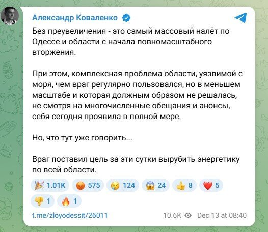 "Odesa is tough... The last time we saw such an intensive missile threat was in 2023, during the grain terror campaign. That, incidentally, was when officials pledged to reinforce missile defenses in Odesa... Right, right. We remember, we remember, we remember..." Kovalenko continued. "Without exaggeration, this is the most massive raid on Odesa and the region since the start of the full-scale invasion. Furthermore, the complex problem of the region's vulnerability from the sea, which the enemy has regularly exploited—albeit on a smaller scale—and which has not been properly addressed despite numerous promises and announcements, has now fully manifested itself," the analyst stressed.