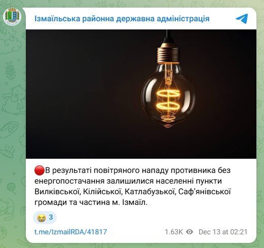 Specifically, the Izmail District State Administration (in the south of the Odesa region) announced that the air attack left settlements in the Vilkovska, Kiliyska, Katlabuzhska, and Safyanivska hromadas (communities), as well as part of Izmail city, without power.