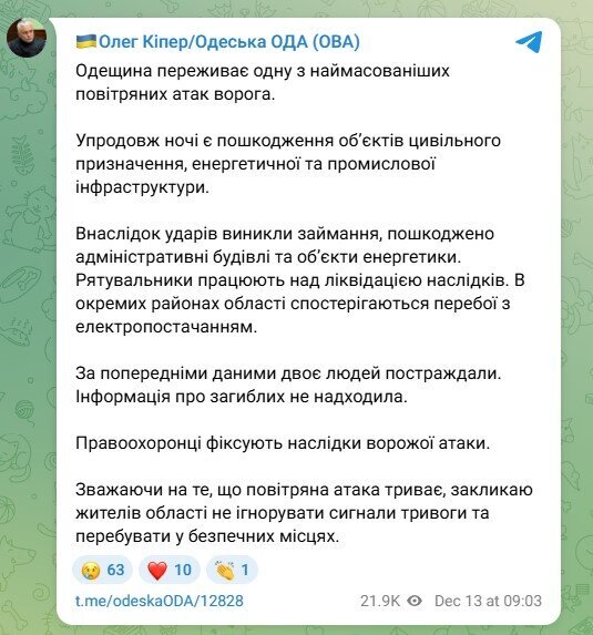 Oleh Kiper, the head of the Odesa RMA, emphasized that the Odesa region is enduring one of the most massive aerial attacks.