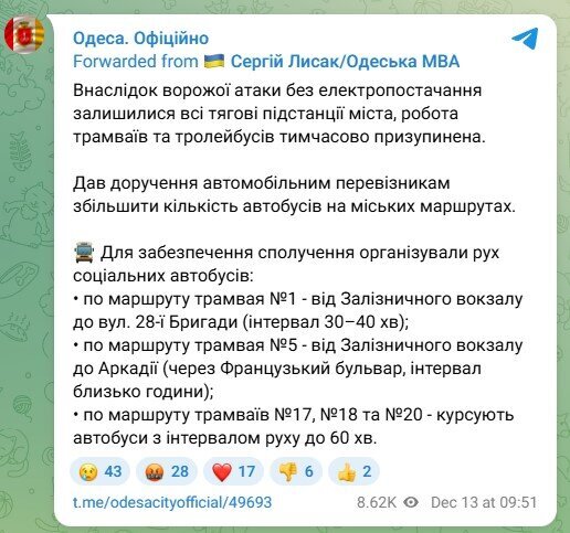 According to Lysak, the attack knocked out all of the city's traction substations, halting the operation of trams and trolleybuses. He noted that he has instructed bus carriers to increase the number of buses on city routes.
