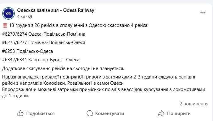 The Odesa Railway branch stated that train movements may be delayed due to the security situation in the Odesa region. A number of suburban trains will be temporarily suspended today, specifically: