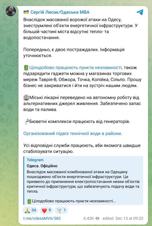 Energy infrastructure facilities in the regional center (Odesa city) were also de-energized. Most of the city is without heating and water supply. All services are working to stabilize the situation.