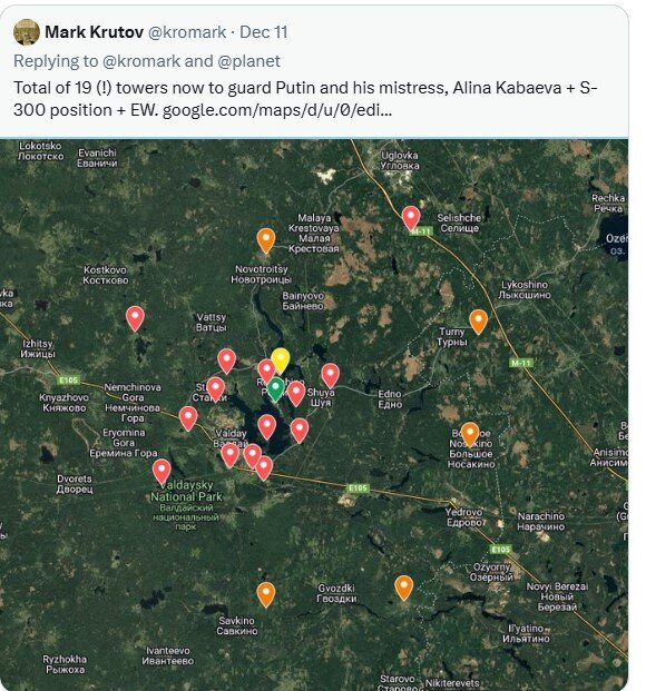 Notably, Radio Free Europe/Radio Liberty journalist Mark Krutov posted a map showing a dense ring of air defenses around Putin's Valdai residence—the same site Kremlin officials claim Ukraine attacked.