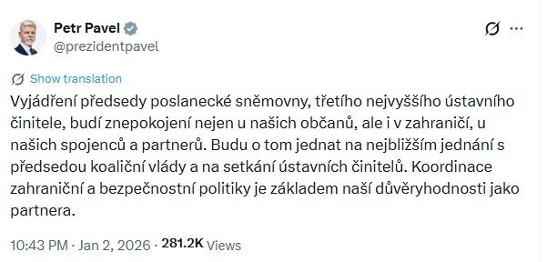 Czech President Petr Pavel intends to discuss the controversial New Year's speech by Chamber of Deputies Speaker Tomio Okamura with Prime Minister Andrej Babiš. In his address, the politician lashed out at Ukraine, labeling Volodymyr Zelensky's inner circle a "junta."