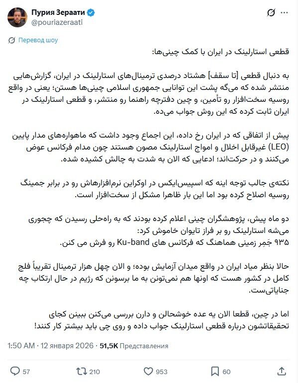 Essentially, Russia provided the equipment, and China published the instructions. The Starlink outage in Iran proved that this method works. Before these events, there was a widespread belief that low Earth orbit satellites were not susceptible to jamming, and Starlink signals were protected because they constantly change frequencies and move. This claim has now come under serious scrutiny.