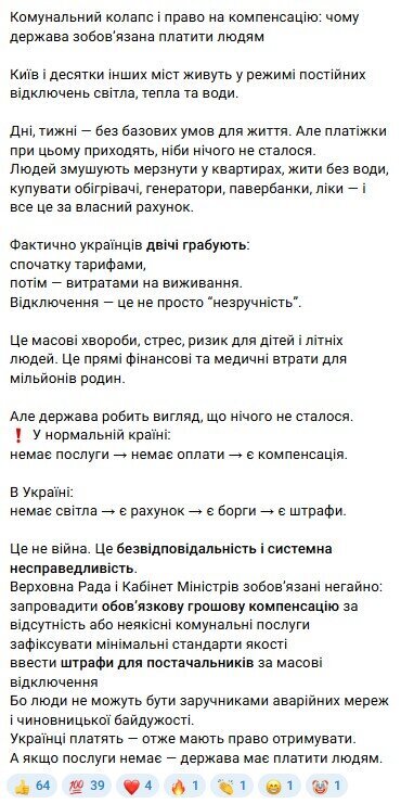 According to him, Kyiv and dozens of other cities are living in a mode of constant lack of electricity, heating, and water. Despite people remaining without basic conditions for weeks, utility bills continue to arrive in full, as if the services were provided uninterrupted.