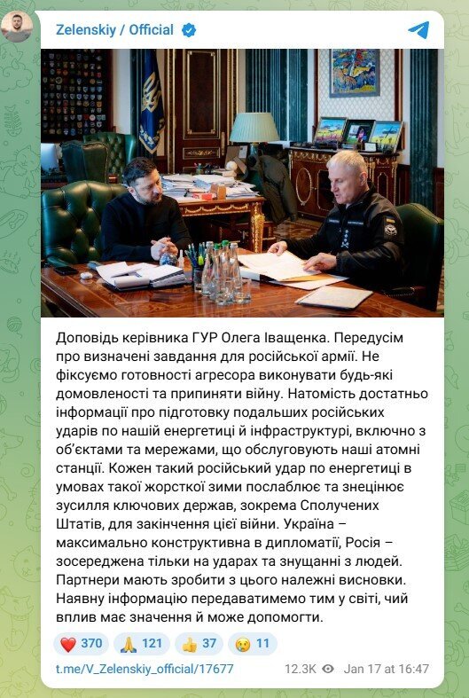"Every Russian strike on the energy sector amid such a harsh winter weakens and devalues the efforts of key states, particularly the United States, to end this war. Ukraine is maximally constructive in diplomacy; Russia is focused only on strikes and tormenting people," the Head of State noted.