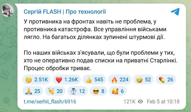 These decisive measures follow alarming reports from the front. On January 25, Serhii "Flash" reported the likely use of Starlink on Russian Shahed strike drones. Elon Musk responded to the Ukrainian government's request for assistance.