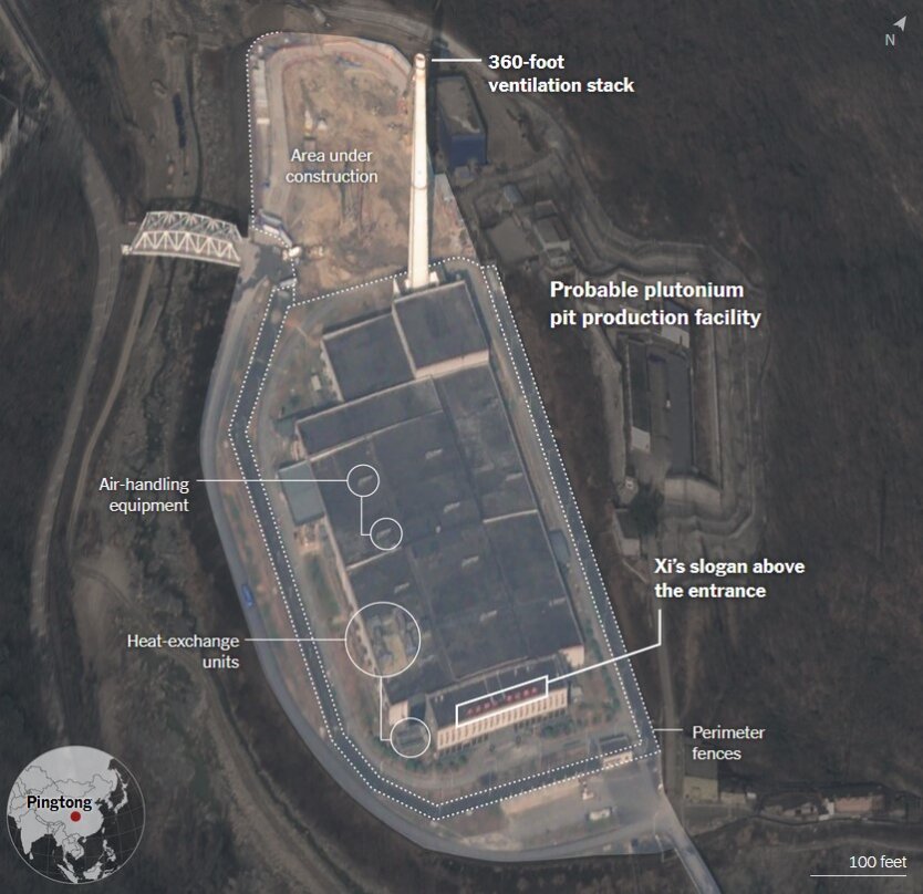 In another valley lies the Pingtong facility, surrounded by a double fence. Experts believe China manufactures plutonium pits for nuclear warheads here. The main structure, dominated by a 110-meter (360-foot) ventilation stack, has been upgraded in recent years with new vents and heat dissipators. New construction continues nearby.