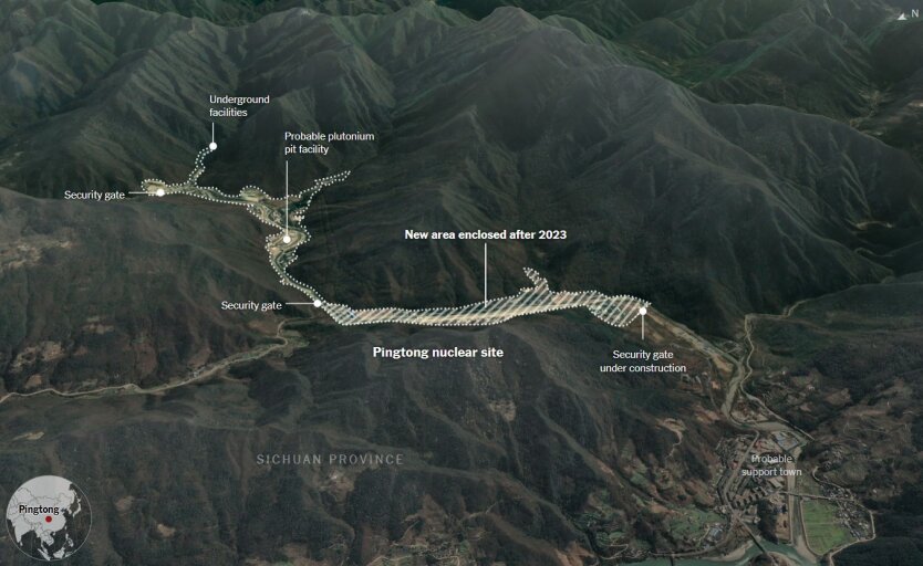 One such valley is known as Zitong in Sichuan province, where engineers are constructing new bunkers and shafts. The new complex is riddled with pipes, indicating the facility handles highly hazardous materials.