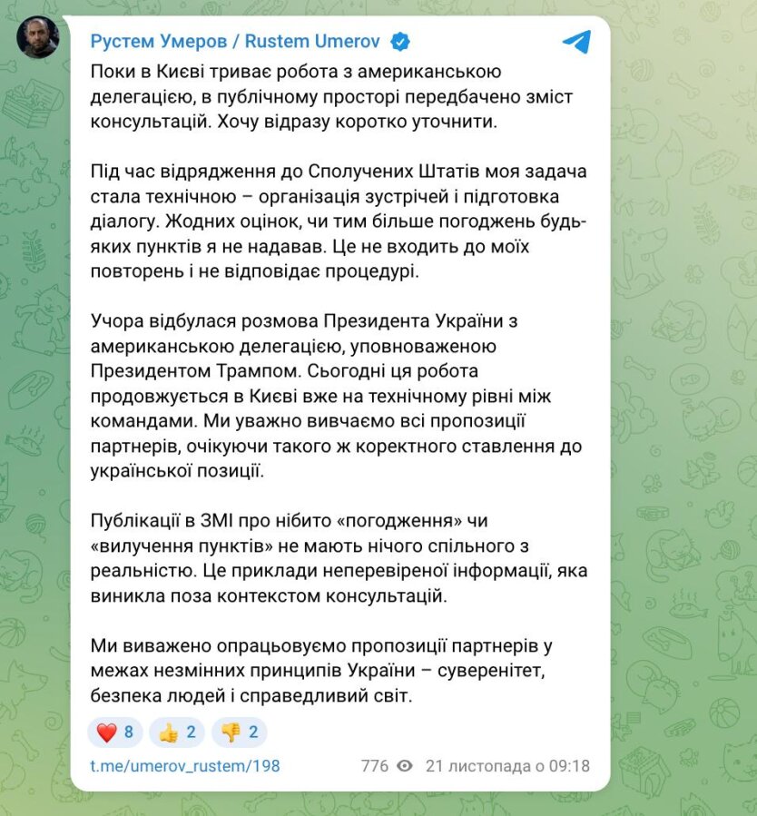 Umerov publicly denied these claims. He stated that he offered no assessment of the US peace plan and did not sign off on any of its provisions. He described his US visit as strictly technical, focused on organizing meetings and preparing for dialogue.