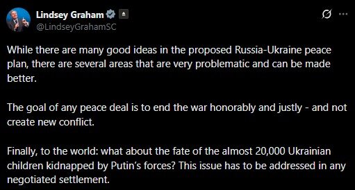 The senator also separately raised the issue of abducted children. "What about the fate of nearly 20,000 Ukrainian children kidnapped by Putin's forces? This issue must be addressed in any negotiated settlement," Graham stated, appealing to the global community.