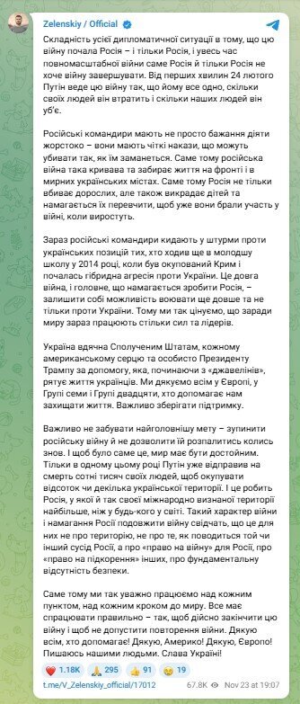 "And this is being done by Russia, which already has more internationally recognized territory than anyone else in the world. This nature of the war and Russia's attempts to prolong it indicate that for them, it's not about territory, not about how one or another neighbor of Russia behaves, but about Russia's 'right to war,' its 'right to subjugate' others, about a fundamental lack of security. That is why we are working so meticulously on every point, on every step toward peace. Everything must work correctly—so that this war genuinely ends and so that a repeat of the war is prevented. Thank you to everyone who helps! Thank you, America! Thank you, Europe! I am proud of our people. Glory to Ukraine!" the Ukrainian leader concluded.