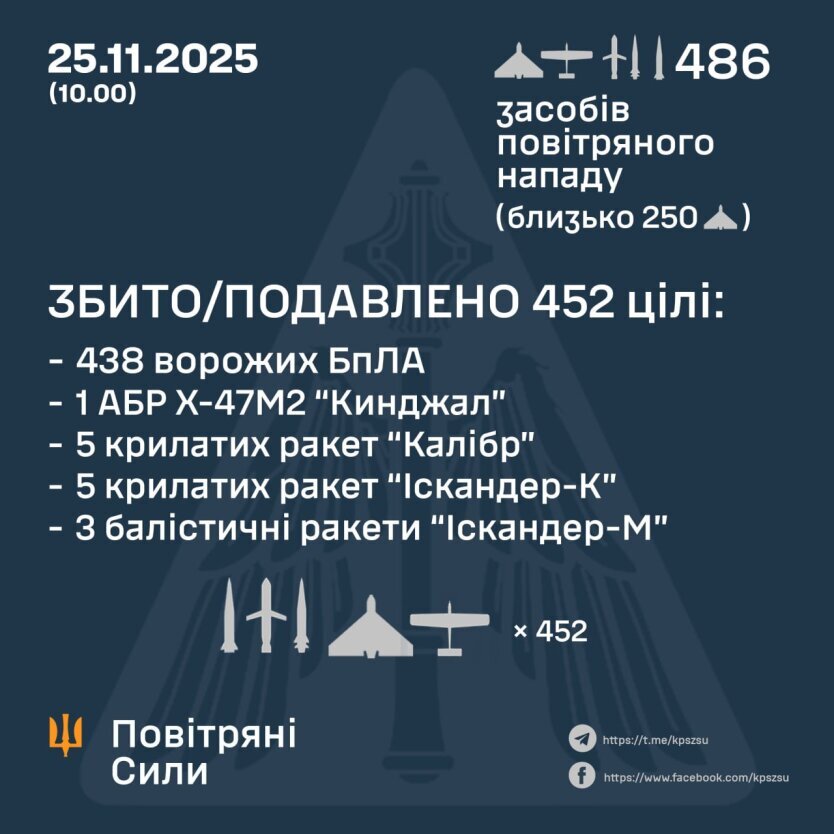 Russia launched a large-scale combined attack overnight on Kyiv, the surrounding region, and several other areas across Ukraine, utilizing Shahed UAVs and, according to preliminary reports, Kinzhal, Kalibr, and Iskander-K missiles. The strikes lasted through the night and continued into the morning.